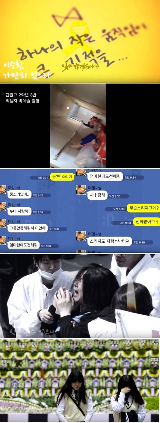 그는 6일 오후, 자신의 페이스북에 누리꾼 ‘Daio Jeong’이 제작한 세월호 희생자를 위한 노래 ‘가만히 있으라’ 추모 영상을 올렸다. 이승환이 공개한 영상은 지난해 4월 세월호 참사가 일어난 진도 팽목항 사고 현장에서 희생자 가족들이 슬퍼하는 모습으로 시작된다. 이어지는 영상에는 세월호 침몰 당시 단원고등학교 학생들이 직접 촬영한 화면도 담겼다. 기울어진 배 안에 앉아서 두려움에 떨고 있는 학생들의 모습도 비춰진다. 또 학생들이 마지막 순간에 가족들에게 보낸 “사랑한다”는 메시지도 공개됐다.